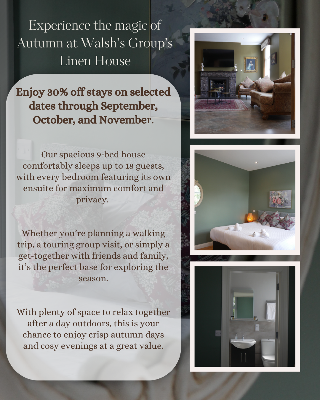 Whether you're seeking a romantic retreat, a relaxing weekend, or a well-deserved getaway, Walsh’s Group is your perfect autumn haven.
