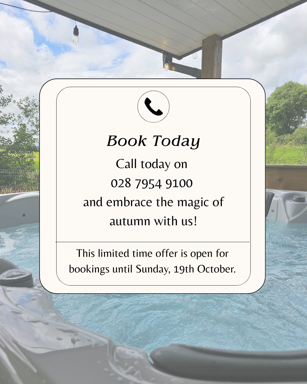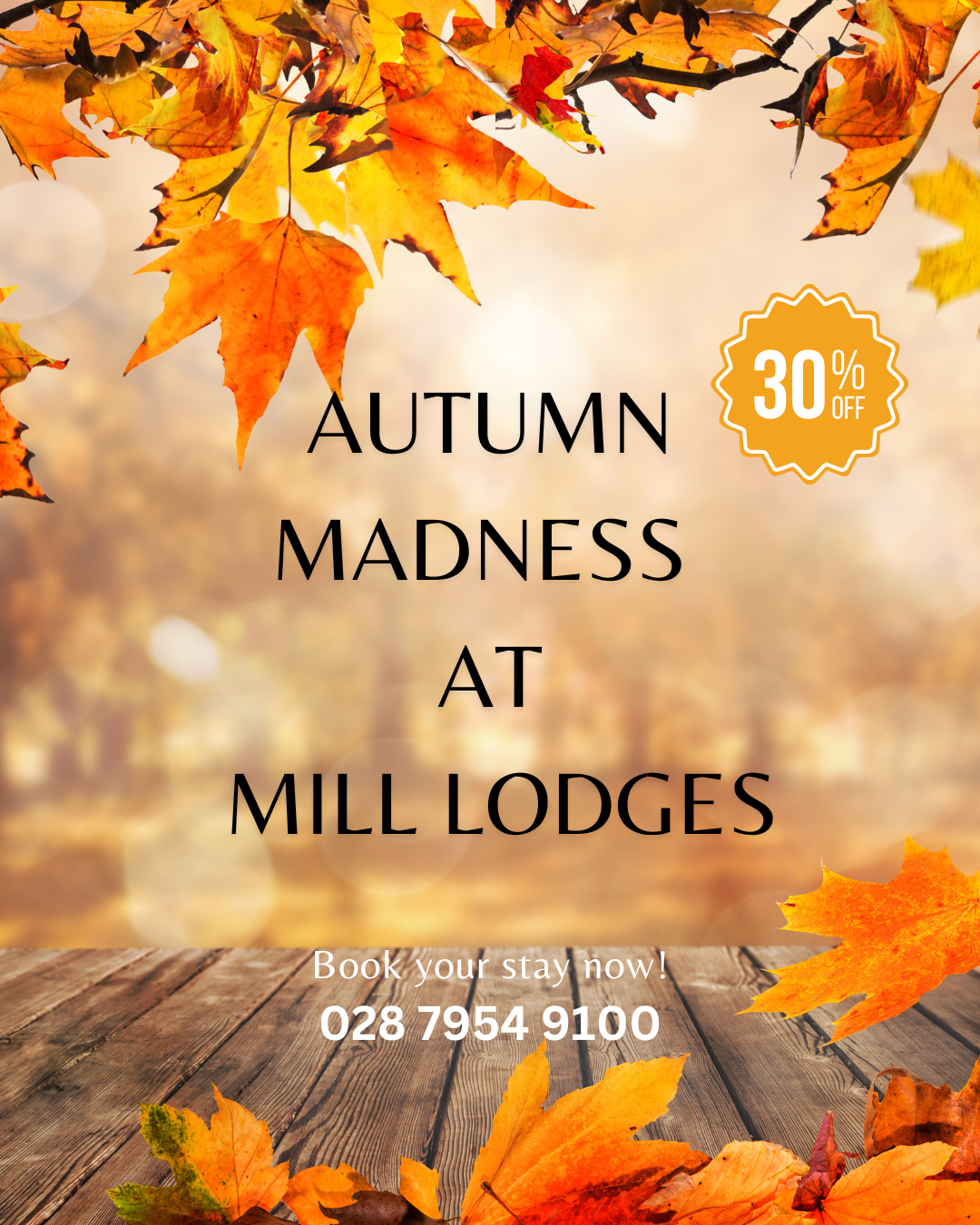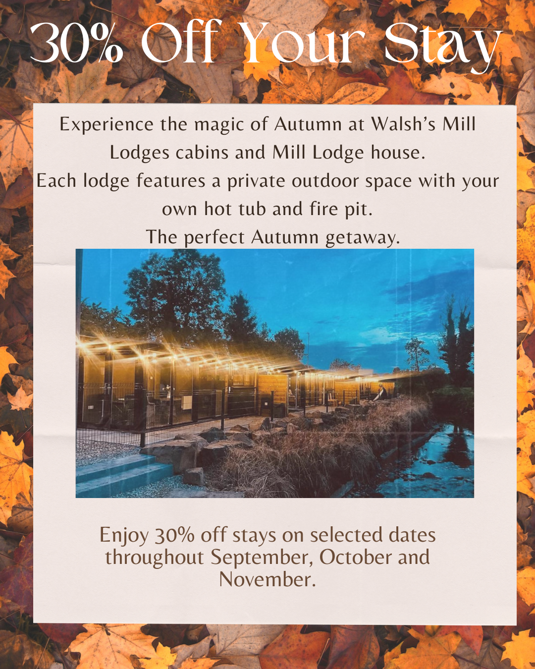 Experience the magic of autumn at Walsh’s Group. Our exclusive Crazy Autumn Offer—enjoy 30% off stays on select dates from September to November at our Mill Lodges or Linen House.
